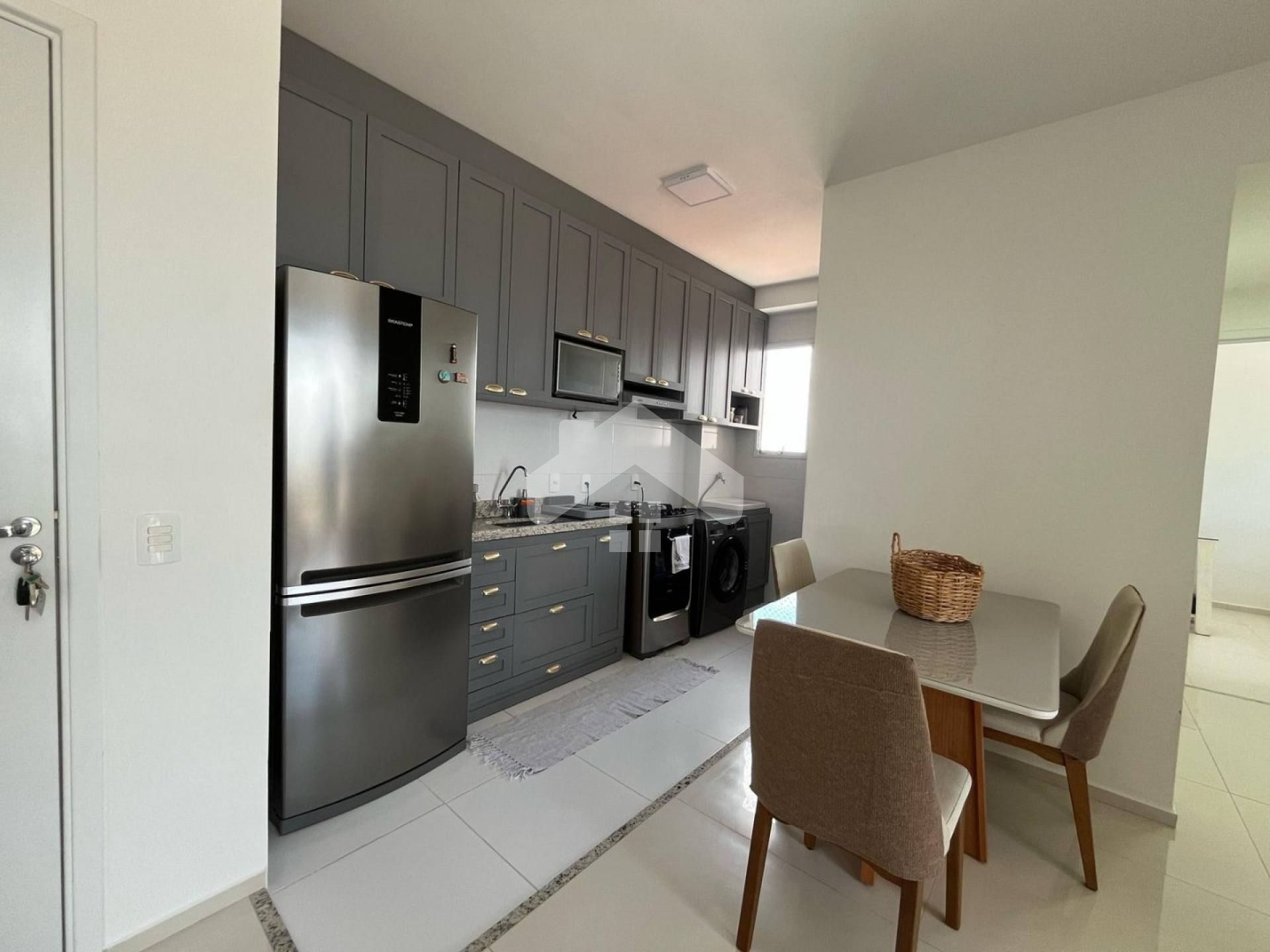 sendo um deles suíte, wc social, cozinha, área de serviço, varanda e laje técnica, piso em porcelanato e armários modulados na cozinha, uma vaga de garagem coberta.